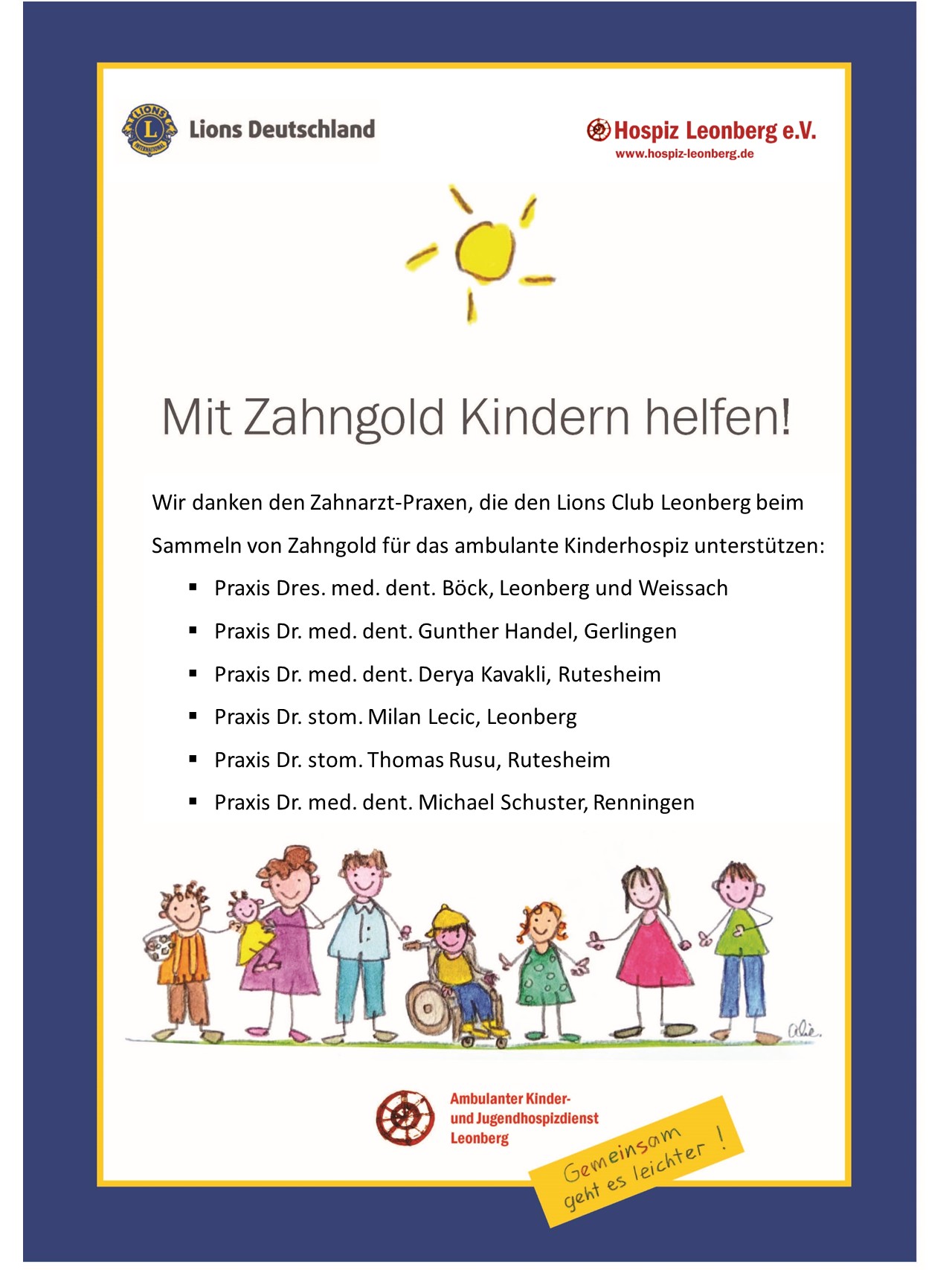 Der Lions Club Leonberg sammelt Zahngold, um es dem Kinderhospiz Leonberg zu spenden! Am 9. Oktober 2025 konnte der Vorstand des Lions Clubs Leonberg dem Kinderhospiz einen Scheck über 12.400 EUR überreichen - der Erlös aus gesammeltem Alt- und Zahngold. Herzlichen Dank an alle Patientinnen und Patienten der teilnehmenden Zahnarztpraxen.